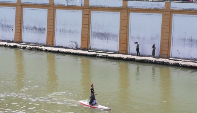 Una mujer vestida de flamenca haciendo paddle surf por el Guadalquivir. Es la estampa que muchos sevillanos se encontraron este miércoles, el que debía ser de Feria de Abril, unas fotos que se hicieron virales en redes sociales por lo llamativas que son.