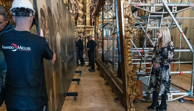 Uno de los mayores desafíos logísticos ha sido el traslado del monumental lienzo ‘Moisés haciendo brotar el agua de la roca de Horeb’, una pintura de 236 x 575 centímetros que normalmente se encuentra en el muro del Evangelio, a varios metros de altura. La complejidad del desmontaje ha sido proporcional al valor icónico de esta obra, que representa la caridad de dar de beber al sediento.