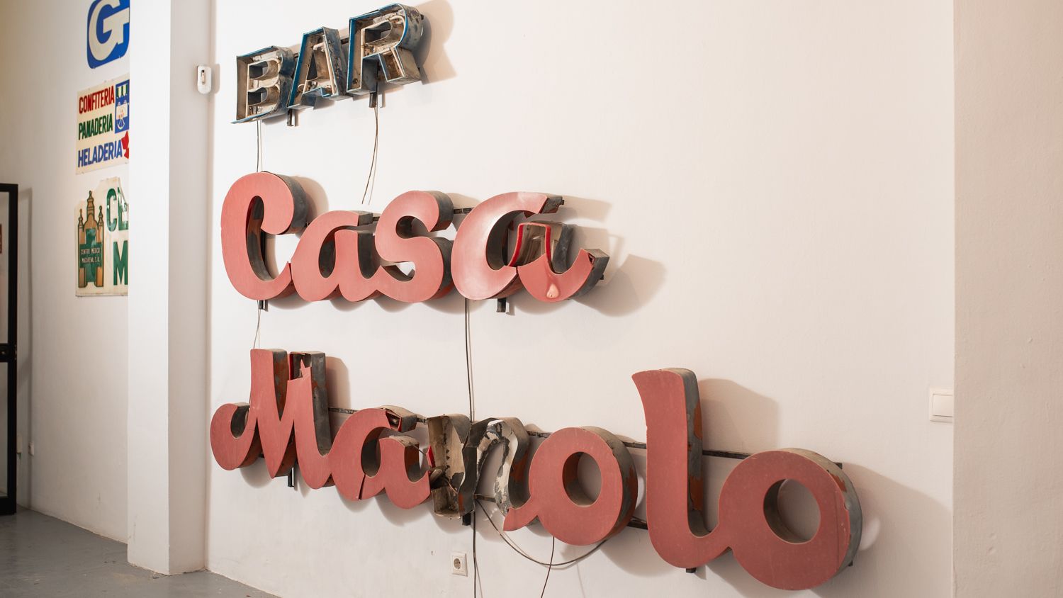 Hay de todo en la exposición, que están ultimando. Desde una farmacia que ha cambiado de manos en la Macarena, donde uno de los rótulos ha pasado a su custodia y el otro de este local en esquina, se va a mantener, en la calle Romero. Aunque una de las joyas es Casa Manolo, en Triana, un cartel enorme y para el que encontraron colaboración en la empresa que tiene el local.