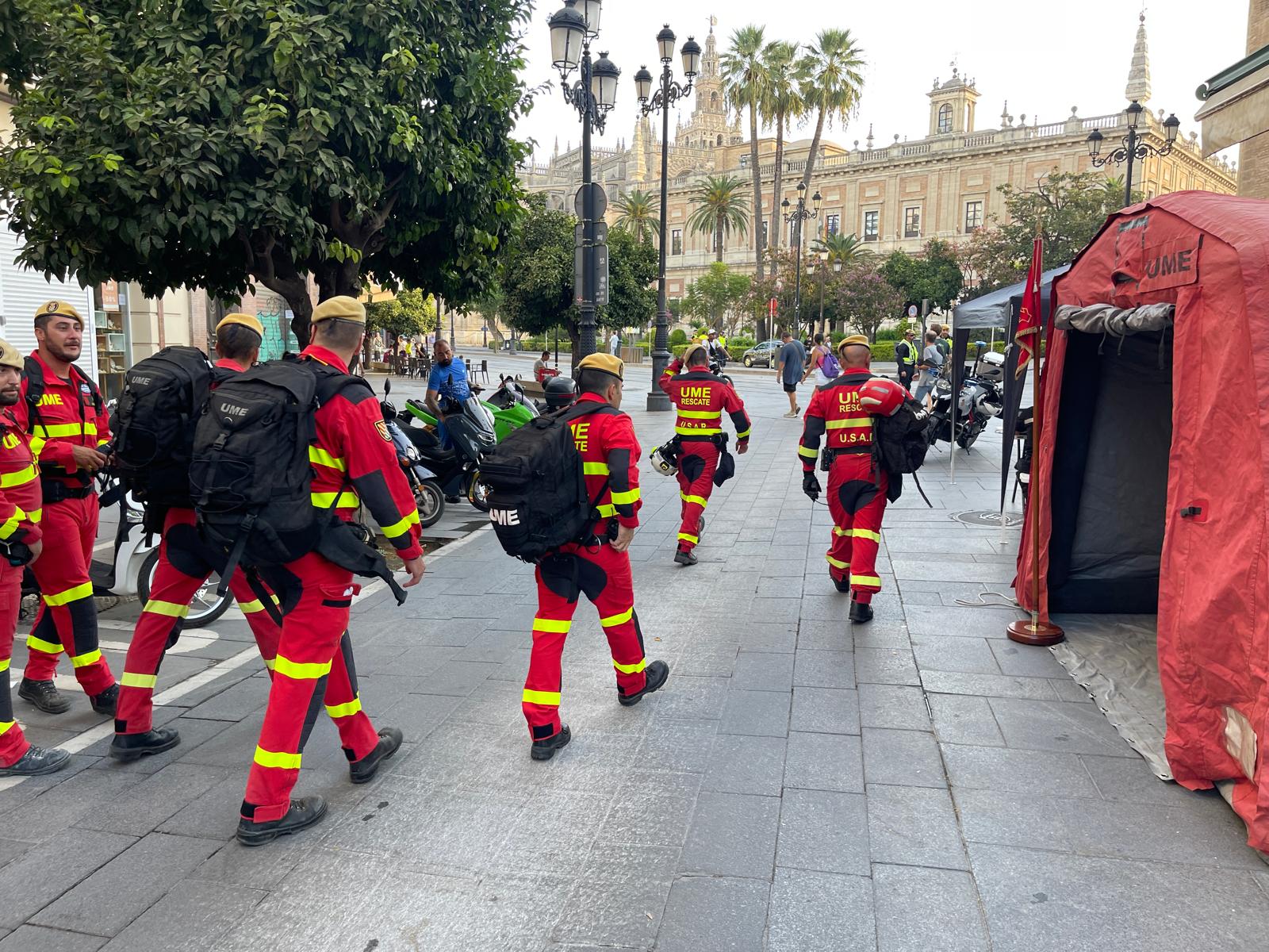 Casi un centenar de militares de la Unidad Militar de Emergencias (UME), dependiente del Ministerio de Defensa, han participado este martes en un simulacro de incendio en la Catedral de Sevilla y en el Archivo de Indias. Los efectivos que han formado parte del dispositivo pertenecían al Batallón de Intervención en Emergencias II (BIEM II).