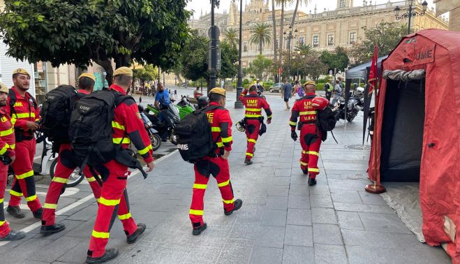 El Ministerio de Defensa ha publicado en redes sociales las imágenes del personal del BIEM II en las calles de Sevilla participando en el operativo, que tiene el objetivo de "estar siempre listos para intervenir".