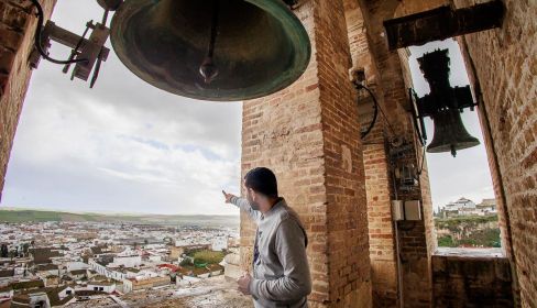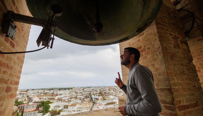Arriba del todo se encuentra el campanario y, al final de una estrechísima escalera de caracol, el mecanismo del reloj, ya eléctrico. Desde la terraza, Juande contempla unas bonitas vistas de Lebrija mientras desvela los nombres de las 13 campanas que le rodean.