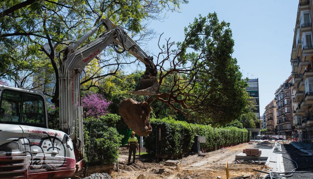 Tras casi un mes de parón, los operarios retomaron los trabajos con nuevas talas de árboles, una acción que, según explica María Jácome, de la plataforma vecinal, no estaba contemplada en el proyecto original. "El viernes vinieron a las 10 de la mañana y sacaron todos los árboles que quedaban".