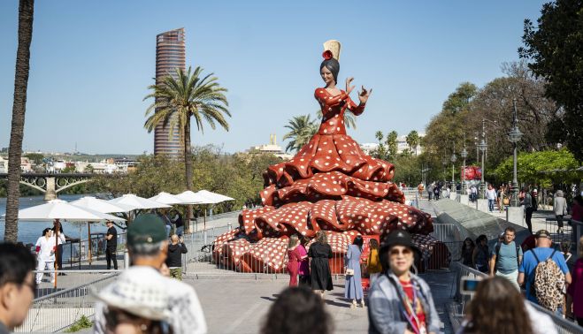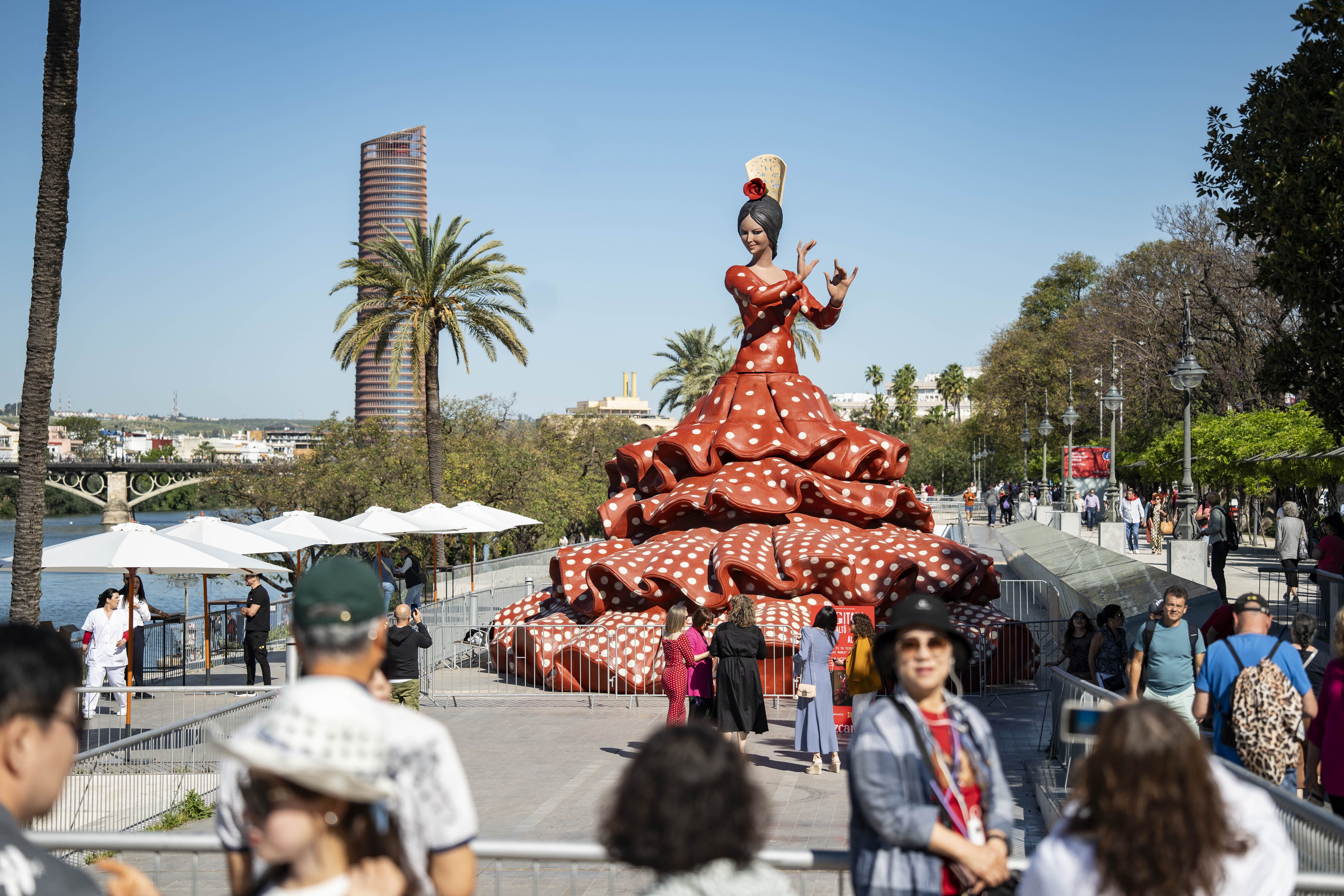 Esta versión "empoderada" de la clásica gitana televisiva busca convertirse en uno de los símbolos de la Feria 2024. Permanecerá en la terraza de la oficina de turismo de Sevilla City Office, orientada hacia los puentes que conducen al Real desde el centro de la ciudad.