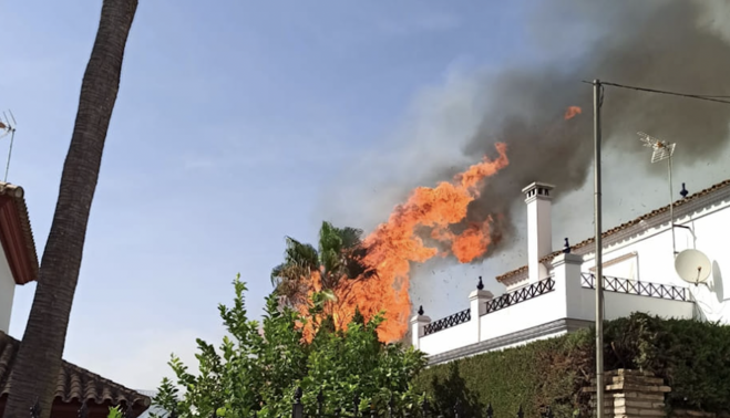 Aparatoso incendio en la urbanización Vía Augusta de Écija, en Sevilla. Un incendio se ha desatado en esta zona donde las llamas han alcanzado este jueves a las 16.00 horas a un total de nueve chalets.
