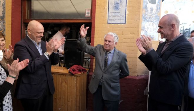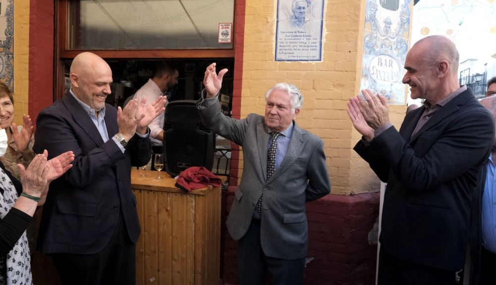 El alcalde de Sevilla, Antonio Muñoz, ha asistido este sábado, junto a la delegada del Distrito Triana, Encarnación Aguilar, y al hermano mayor de la Esperanza de Triana, Sergio Sopeña, al acto de homenaje a José Cárdenas Gómez, propietario del bar Santa Ana, a quien se le han rendido honores y se le ha despedido por todo lo alto de un negocio en el barrio de Triana que ha regentado durante casi 60 años.
