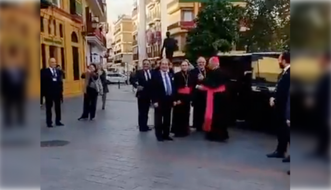 Tras la salida de la Basílica de la Macarena, los emisarios del Vaticano han recibido unos simpáticos y curiosos gritos de bienvenida: "Esta es la juventud del Papa", se escucha al fondo a un grupo de personas que empezaron a cantar a los representantes de la Santa Sede, que se lo tomaron con buen humor.