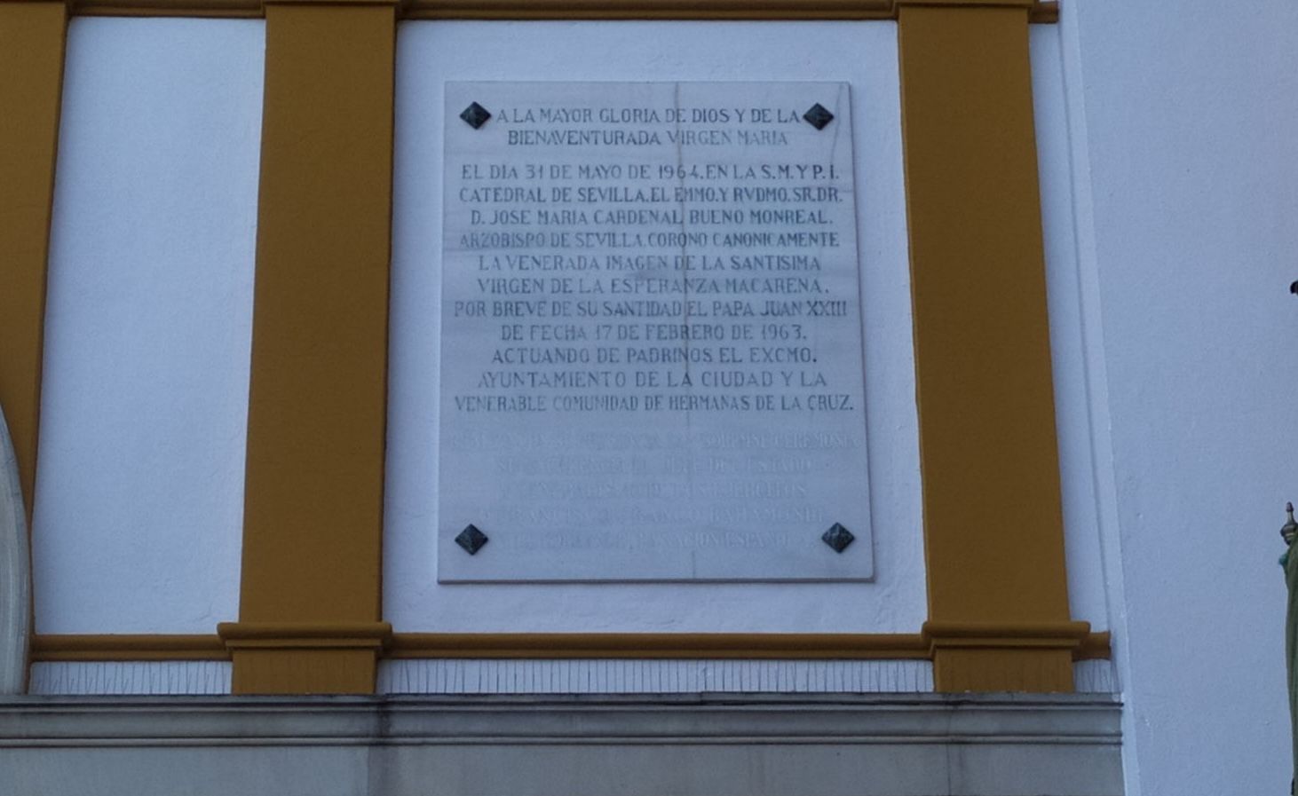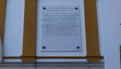 La placa conmemora la coronación canónica de la Virgen de la Esperanza celebrada en la Catedral el 31 de mayo de 1964. En el último párrafo reseñaba: "Realzó con su presencia tan solemne ceremonia Su Excelencia el Jefe del Estado y Generalísimo de los Ejércitos, don Francisco Franco Bahamonde, y el Gobierno de la nación española".