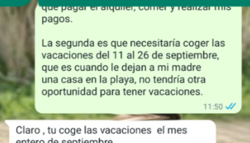 Junto a ello, muestra una conversación vía WhatsApp. En ella, se ve cómo pude "coger las vacaciones del 11 al 26 de septiembre", es decir, 15 días, "que es cuando le dejan a mi madre una casa en la playa, no tendría otra oportunidad para tener vacaciones".