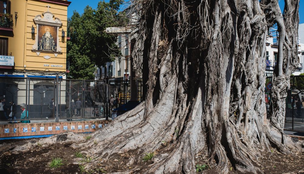 El paisajista, arquitecto y activista sevillano Ricardo Librero, explicaba esta semana que el estado del ficus de San Jacinto es preocupante: "Ampliado y recrecido el parterre del ficus y relleno con 40 centímetros de tierra preparada. A pesar de ser un ficus, el intento de tala que acabó con el 80% de su volumen y la posterior aplicación del decreto de sequía, hasta que se volvió a regar el agosto pasado, ha reducido mucho las posibilidades de supervivencia, pero si hay alguna esperanza, parte de que está primavera pueda emitir nuevas raíces y encuentre suelo libre para desarrollarse, como el que se ha colocado. Queda mucho por hacer y queda que esperar".