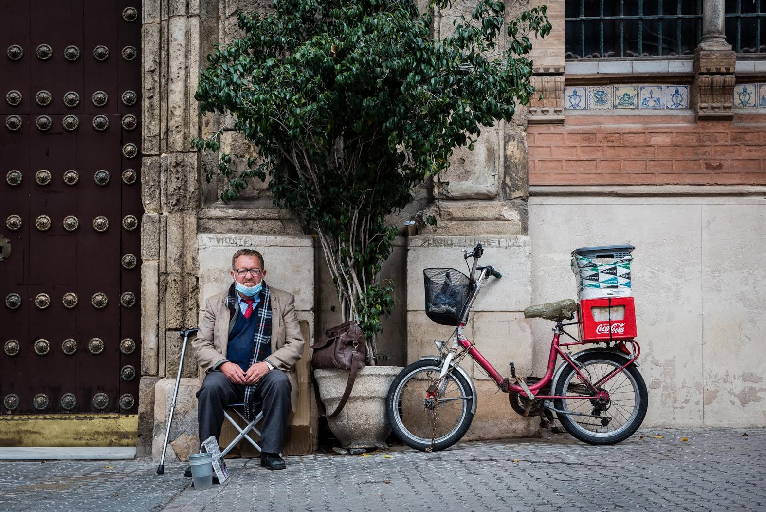 Mihai Topoliceanu viste con corbata y abrigo elegante. Se encuentra sentado, junto a su bicicleta, en la puerta de la Iglesia de San Pedro de Sevilla. En noviembre cumplirá 65 años y lleva 13 fuera de su país, Rumanía. Sobrevive en la capital hispalense desde entonces con lo que consigue en las puertas de la iglesias.