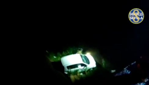 🟥21:45 h. #Bomberos ha intervenido en A-92 #Sevilla por la colisión de un camión a un turismo que salió despedido fuera de la vía, cayendo por un desnivel de 8 metros a un canal de riego.