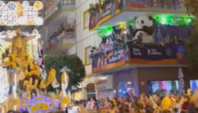 En la cabalgata de Sevilla se ha vivido uno de esos momentos de ver para creer. Al paso del rey Baltasar por la calle Asunción suenan los sones de la marcha Esperanza de Triana Coronada y, desde un balcón, un oso panda de grandes dimensiones se mece de costero a costero.