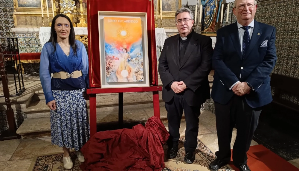 El Consejo de Hermandades y Cofradías de Sevilla ha presentado en la Capilla de Santa María de Jesús el cartel anunciador del Junio Eucarístico 2024, obra de Isabel Sola. Una obra que está realizado sobre tabla con tintas acrílicas de aerografía, pintura acrílica, acuarela, pasta de modelado y resina epoxi.
