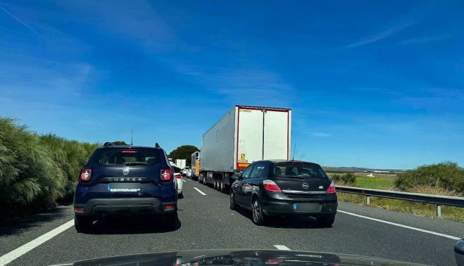Los primeros atascos no han tardado en llegar y las salidas desde Sevilla hacia las diferentes provincias costeras ya tienen retenciones. No son las únicas debido a que a la altura de Los Palacios también hay un parón importante en dirección a Cádiz. El trayecto que habitualmente se realiza en una hora y 20 minutos, tiene actualmente alrededor de media hora de retrasos.