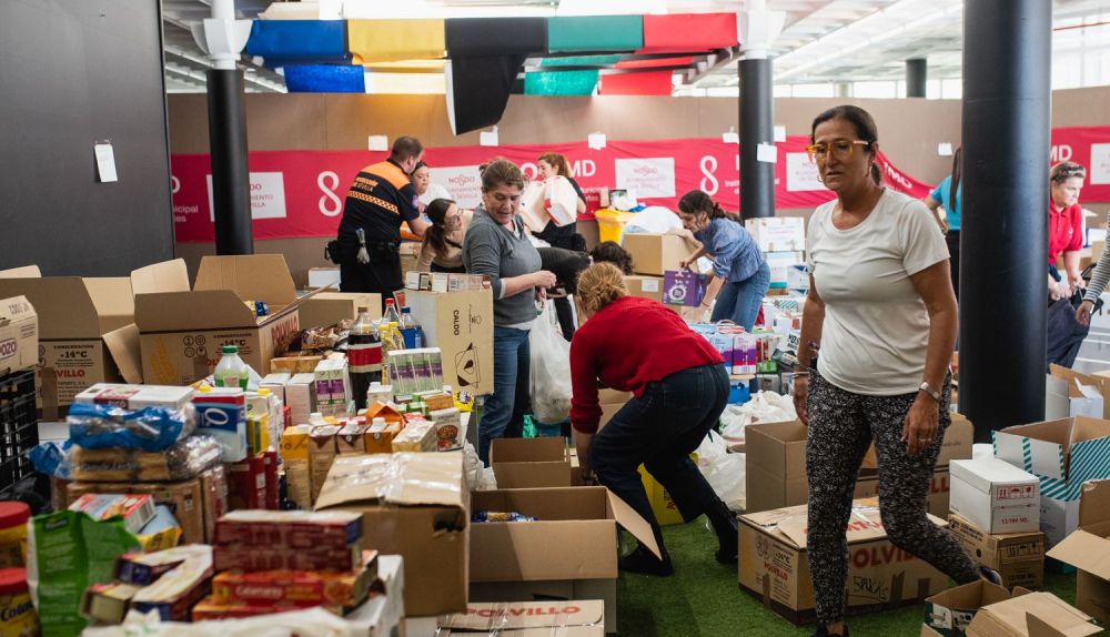 Un reguero de coches no paraba de llegar por una de las entradas a las instalaciones del Centro Deportivo San Pablo. Personas acarreando bolsas también a pie, desbordando. En uno de los espacios que dan al exterior, una sala de aire deportivo, de suelo con rayas blancas pensada para ejercicios, no se para de sudar. Porque no paran de correr de un lado a otro los voluntarios que utilizan esta sala del IMD para recoger lo que sale de coches, de furgonetas y hasta de camiones medianos. Es un muelle improvisado de carga y descarga.
