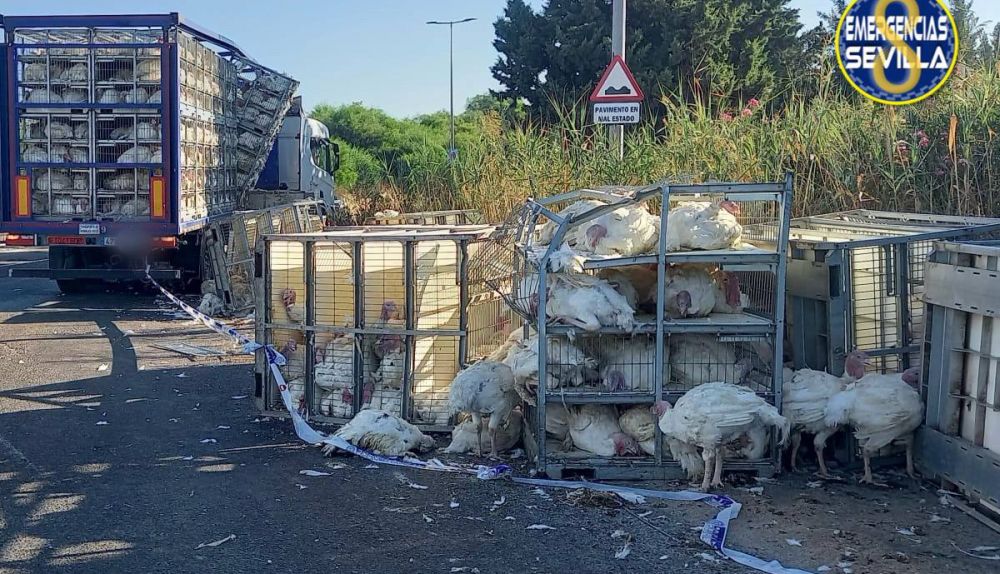 La Policía Local y el Ayuntamiento de Sevilla han informado del suceso a través de canales oficiales, señalando que la zona ha sido acotada por seguridad mientras los agentes regulan el tráfico y gestionan los desvíos necesarios. En las imágenes difundidas por Emergencias Sevilla puede verse parte de la carga caída en la calzada: jaulas con pavos, algunas de ellas visiblemente dañadas, y con algunos pavos fuera de ellas libres.