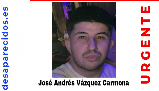 José Andrés Vázquez Carmona fue visto, al parecer, en la Carretera Amarilla de Utrera. Tiene 24 años, mide 1,70 metros de estatura y es de complexión delgada.