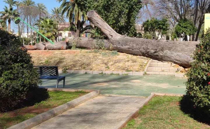 Una tormenta con rachas de viento que llegaron a alcanzar los 80 y 100 kilómetros por hora arrasó con distintos conjuntos de arbolados. Entre ellos, 100 ejemplares de este parque. El temporal tumbó otro eucapilto gigante, además de pinos con unos 30 años de antigüedad y otras plameras y arbustos.