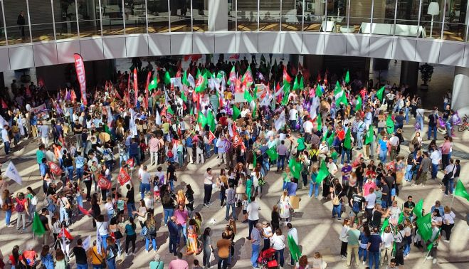 Por ello, desde UGT se ha alentado a la protesta. "Más de 1000 personas se han concentrado esta mañana en Sevilla ante el centro comercial Nervión Plaza, para pedir a la Junta la regulación de los horarios comerciales que permite abrir en Domingo impidiendo la conciliación familiar de lxs trabajadores. ¡Basta ya!"