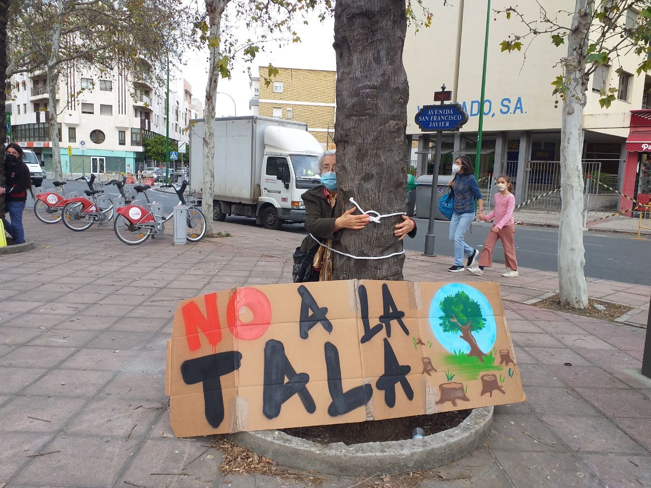 A modo de protesta, los activistas se han atado simbólicamente a a algunos de los árboles de la gran isleta que existe en la confluencia de San Francisco Javier con Ramón y Cajal, cuya arboleda será enteramente arrasada próximamente al estar diseñado justo por ahí el paso referido, acompañadas por varias pancartas y carteles alusivos.La acción de hoy viene a sumarse a la manifestación ciudadana del pasado día 2, que fue promovida por esta plataforma y apoyada finalmente por 24 entidades ciudadanas y ocho partidos políticos, que recorrió las avenidas de Luis de Morales y de San Francisco Javier, las más afectadas por esta intervención urbana. La intervención se suma también a la del pasado 24 de junio de 2020, impulsada por el colectivo Tranvía Verde.