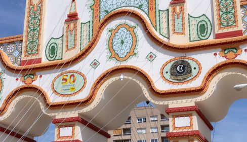 La portada que da acceso al recinto ferial de Los Remedios presenta unas dimensiones de gran envergadura y una notable complejidad técnica. En su construcción se han empleado alrededor de 30.537 metros de tubos y 3.777 metros cuadrados de panelado. Sus medidas alcanzan los 40 metros de ancho y 40 de alto, con una profundidad de 5,70 metros, y está formada por más de 6.000 piezas de carpintería.