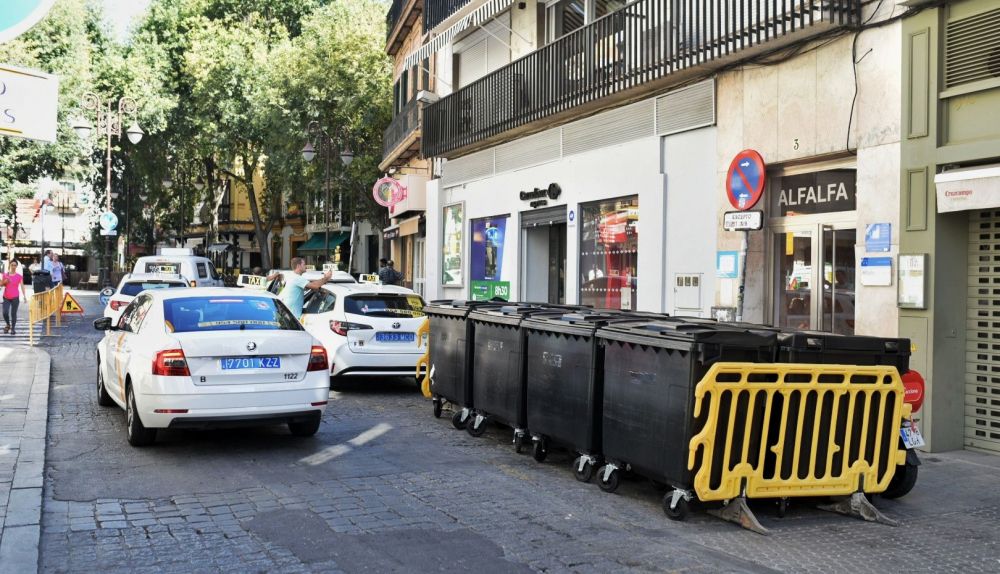 El centro de Sevilla tiene paradas que van rotando con rapidez, zonas donde hay un flujo de clientes que requieren del taxi. Pero otras son paradas para estar atentos a las llamadas en el entorno. La Alfalfa, que es una zona no tan concurrida de usuarios del taxi como esas otras de altísima demanda, viene a ser una de esas paradas algo más tranquilas. El flujo existe, pero por momentos, este punto de espera del taxista pierde parte de su capacidad de tener vehículos.