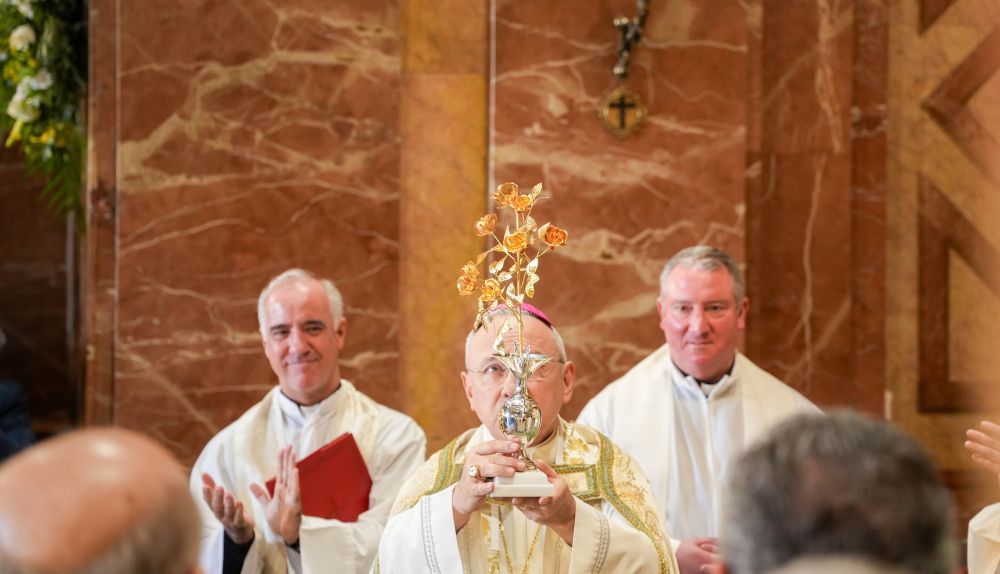 La Esperanza estuvo al pie del presbiterio y dirigiéndose a Ella, el prelado dijo que “cada uno hemos venido a esta basílica como peregrino, y el peregrino viene siempre necesitado de que la Virgen escuche nuestras plegarias y atienda nuestras súplicas”. Al término de su alocución, y tras expresar el “saludo afectuoso y bendición de parte del Papa Francisco”, el legado pontificio colocó la Rosa de Oro a los pies de la Virgen, que se encontraba en el presbiterio, momento en el que los asistentes rompieron la solemnidad del acto con un largo aplauso acompañado por el repique de las campanas de la basílica.
