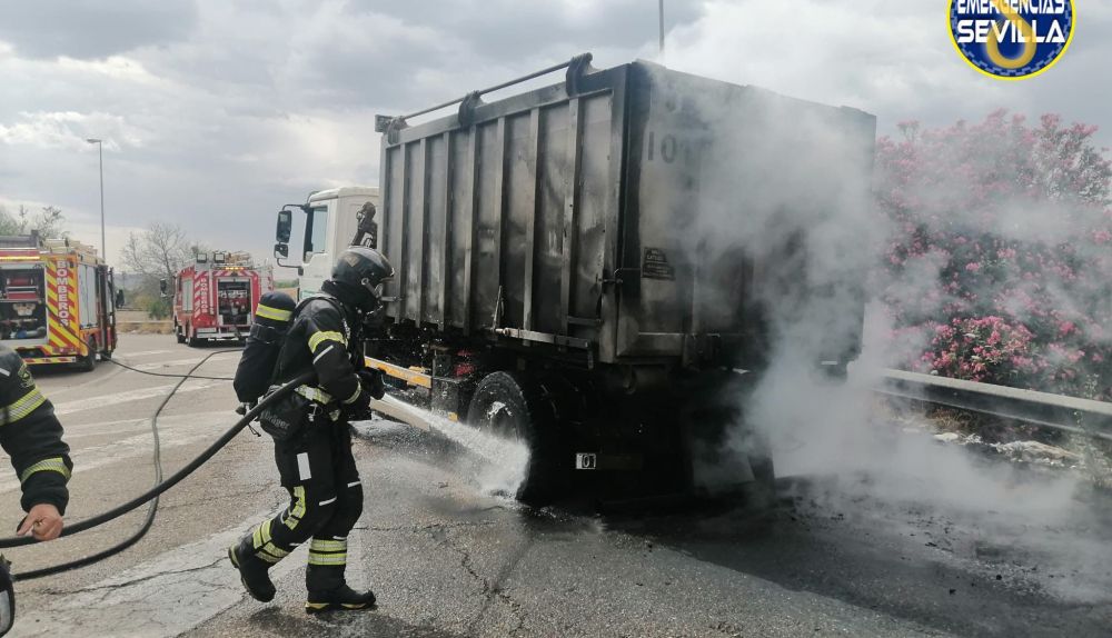 Bomberos de Sevilla han tenido que intervenir para apagar el incendio que se había originado en un camión en marcha.