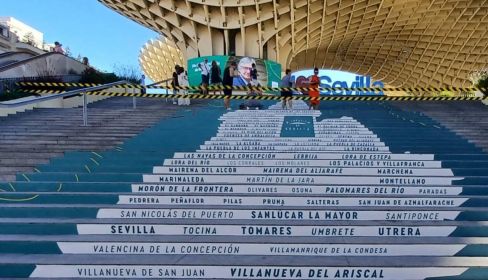Marinaleda, Morón de la Frontera, La Puebla de los Infantes, La Rinconada, Espartinas, Utrera, Villanueva del Ariscal... Todos los nombres de estos municipios y más conforman esta singular composición que este sábado jalona las escaleras de Las Setas.