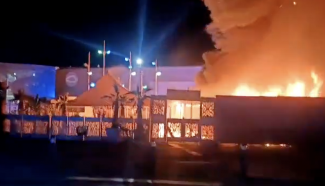 A su llegada al lugar, los efectivos se encontraron con unas grandes llamas, tras el aparatoso incendio desatado en Zumbao Terraza, uno de los negocios de este centro comercial.