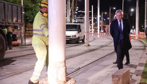 El alcalde de Sevilla, José Luis Sanz, ha supervisado esta pasada madrugada el desmontaje de las catenarias y los 22 postes de la línea del tranvía en el entorno de la plaza Don Juan de Austria, entre el Prado de San Sebastián y calle San Fernando. Los trabajos comenzaron pasadas las 12 de la noche y tendrán una duración aproximada de 10 días.