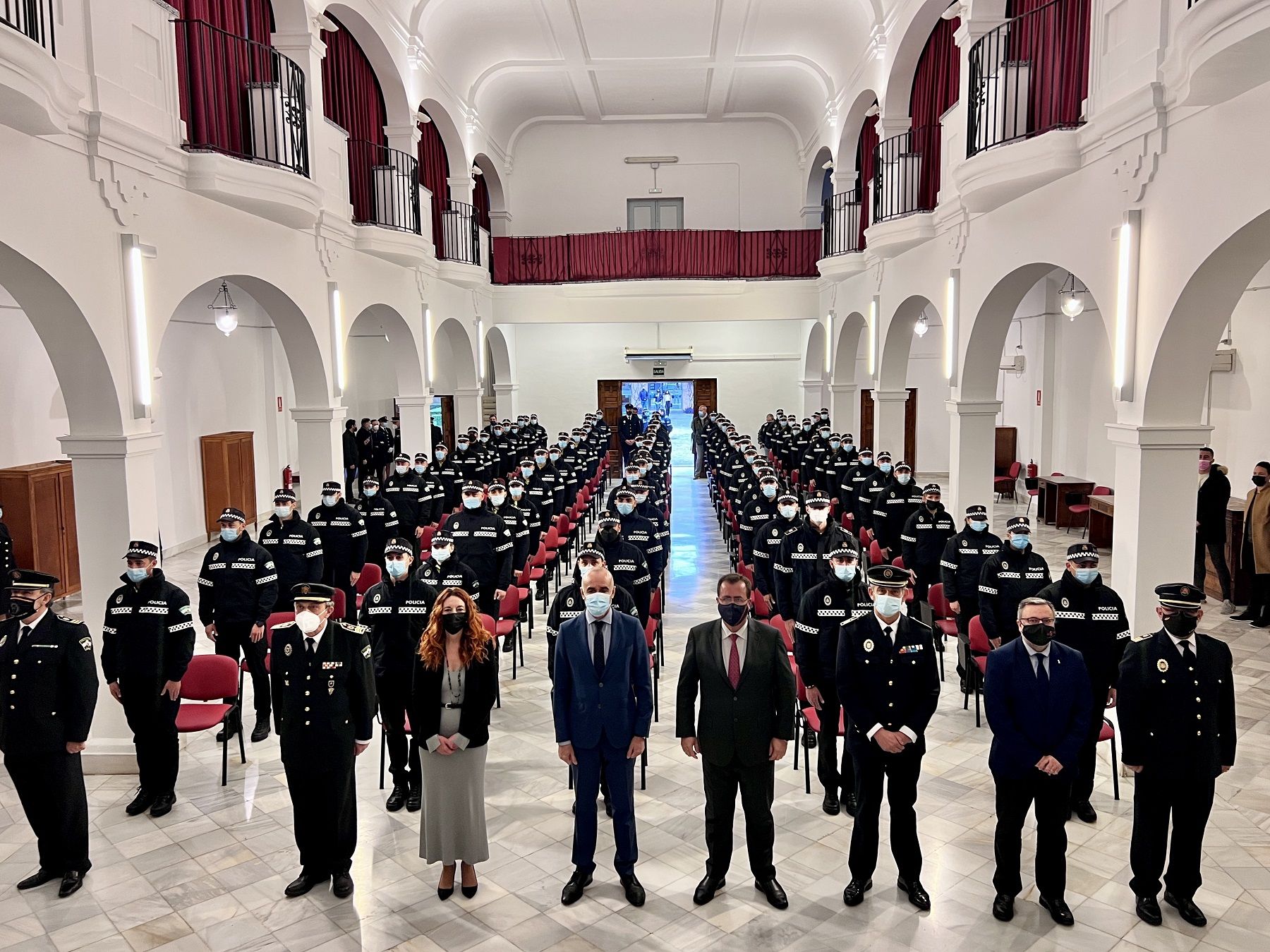 El alcalde de Sevilla, Antonio Muñoz, ha presidido hoy, junto con el delegado de Gobernación, Fiestas Mayores y Área Metropolitana, Juan Carlos Cabrera, y la delegada de Recursos Humanos y Modernización Digital, Clara Macías, el acto de toma de posesión de 58 nuevos agentes de la Policía Local, de ellos 9 mujeres, que acceden directamente a sus plazas tras superar las pruebas, mientras que otros 33 inician los 9 meses del proceso de formación en academia ya como personal del Ayuntamiento.
