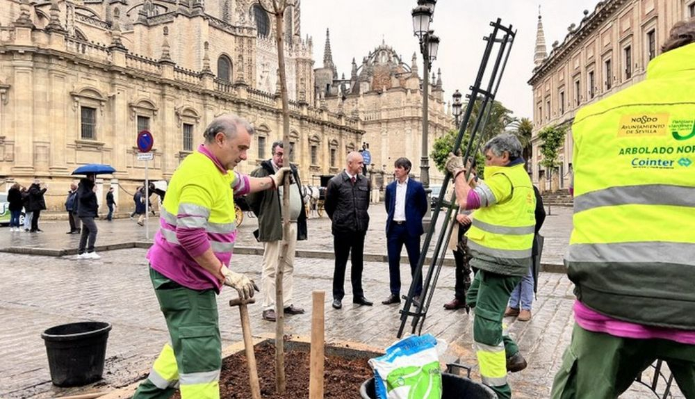 El Ayuntamiento de Sevilla, a través del Servicio de Parques y Jardines, ha plantado hoy cuatro jacarandas frente al Archivo de Indias así como setos de granado a modo de cerramiento alrededor del magnolio de gran porte en la esquina suroeste de la Catedral, con el objetivo de reforzar el valor paisajístico y generar nuevas áreas de sombra en este entorno patrimonial de la avenida de la Constitución.