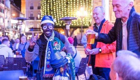 Además, este miércoles el centro de Sevilla estaba pintado de azul. Por el desembarco de aficionados del Glasgow Rangers, el mismo equipo que en 2022 disputó la final de la Europa League en el Ramón Sánchez Pizjuán. Aficionados que vestían con camiseta, porque para un escocés, menos de 20 grados, parece, siguen siendo verano. El senegalés Bamba acude por Navidad a Sevilla para vender entre veladores. Reside habitualmente en Madrid, pero la presencia de mucha gente en Sevilla le trae a la ciudad durante un mes. No ha parado de vender sombreros azules brillantes, aprovechando que las mesas estaban llenas de aficionados. "La Navidad va muy bien. Hay más gente aquí y se vende mucho", asegura antes de retomar rápidamente su ruta entre mesas.