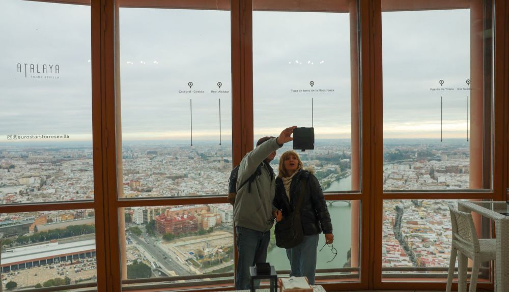 El trasiego de clientes continúa estos días como siempre, por las rebajas. De vez en cuando, alguien comprueba lo difícil que es hacerse un selfi intentando salir con la torre al completo. Desde la planta 19ª hasta la última, se suceden las 244 habitaciones del hotel de cinco estrellas Eurostars, cuyo perfil de exclusividad da para que la Selección Española de Fútbol, por ejemplo, se aloje en él cuando viene a Sevilla. Por lo demás, más guiris que sevillanos, por supuesto, y el llamado Mirador Atalaya desde donde ver tan pequeñita a la Giralda.