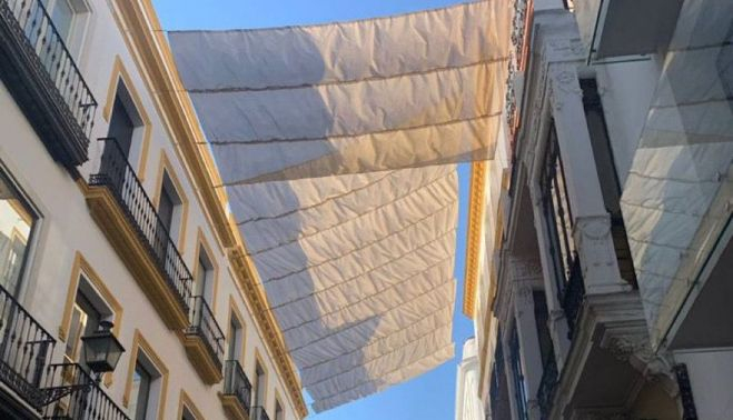 La sombra en Sevilla en la época de verano es todo un lujo. El sol aprieta y las gotas de sudor caen inevitablemente por las frentes de los locales y visitantes. Para hacer más ameno un paseo por el centro, el Ayuntamiento suele instalar toldos que, el año pasado, no llegaron hasta mediados de julio lo que causó la indignación de la población. Ya desde primavera el termómetro se dispara y es todo un desafío cruzar la capital.
