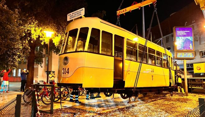 El barrio de Triana ha recuperado este miércoles una de sus estampas históricas. Un vagón del tranvía 314 vuelve a lucir en la Plaza San Martín de Porres, de donde fue retirado hace un tiempo para su restauración.