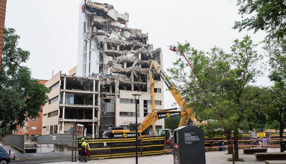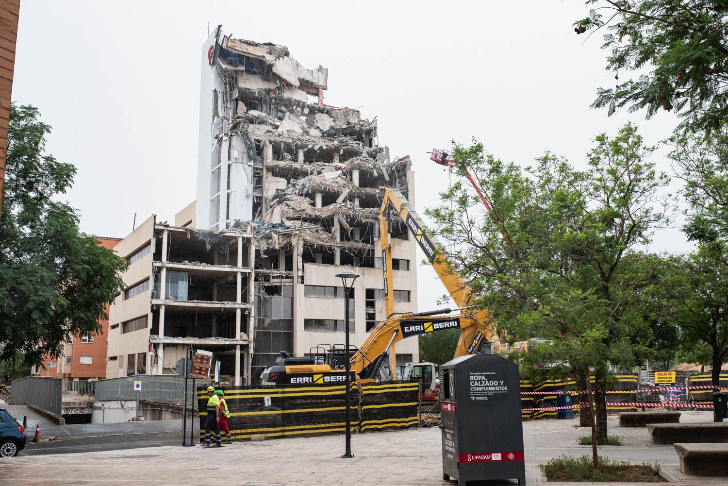 Tras alrededor de un mes de trabajo previo, de preparación, la Torre Mapfre de Sevilla ha pasado a ser ya historia. En las últimas horas, las máquinas han empezado a picar en altura para destruir planta a planta de arriba a abajo.
