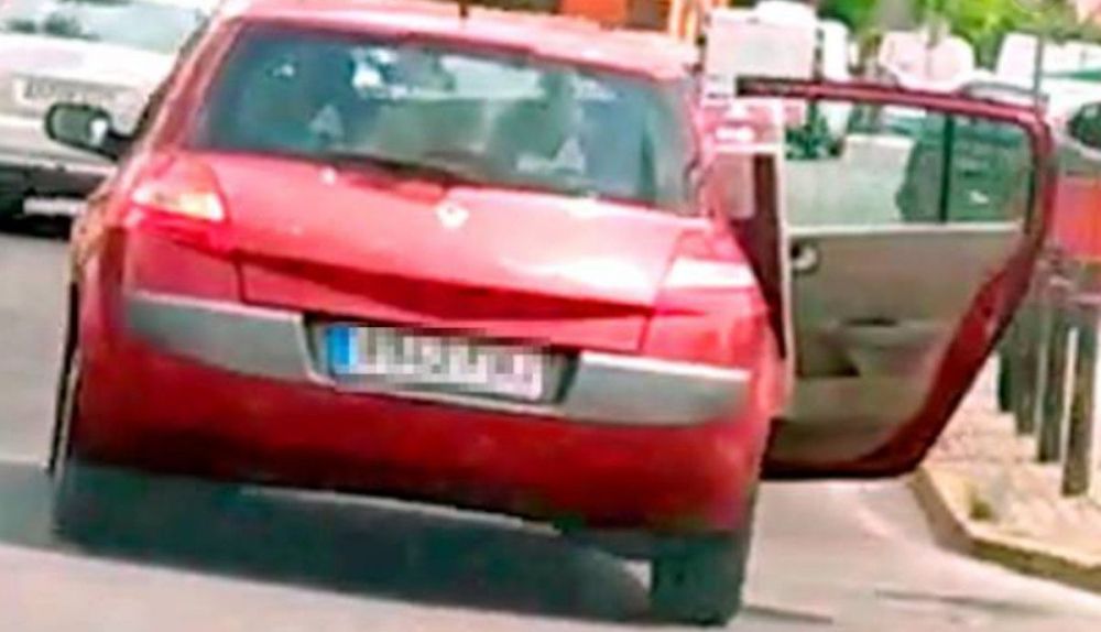 La imagen fue grabada este lunes sobre las 15.30 horas por las personas que viajaban justo detrás del turismo en la rotonda de la plaza de La Trianilla de Utrera. Los ocupantes, asombrados al ver esta escena, rieron al detectar al infractor que conducía de forma peligrosa.