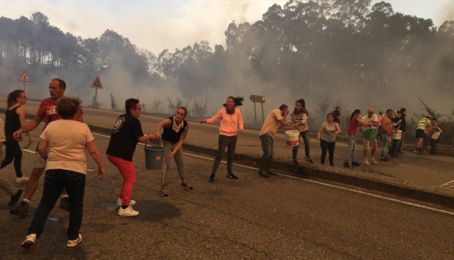 El fuego abrasa Galicia. Las víctimas mortales por los incendios que han asolado (y todavía arrasan) Galicia se han elevado a tres después de que esta madrugada se haya encontrado el cadáver de un vecino de 78 años en Abelenda, en Carballeda de Avia (Ourense) en el jardín de su casa. El anciano trataba de apagar el fuego que amenazaba su hogar y el corral donde estaban sus animales. A última hora de la noche del domingo fueron halladas otras dos víctimas, las dos primeras oficiales de estos incendios, atrapadas en una furgoneta. Ambos cuerpos estaban calcinados. Las llamas encerraron a las víctimas, ambas mujeres, en la carretera que une dos parroquias en Nigrán. A primera hora del lunes siguen activos 57 focos en la región, de los cuales 17 afectan a núcleos urbanos.