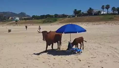 "Se ve que tienen calor, han bajado y no se les ha ocurrido otra cosa que ponerse en la sombrilla", expresa un ciudadano que grabó esta escena tan atípica. No obstante, la presencia de terneros en la playa de Bolonia es habitual, lo curioso es que los mamíferos se agenciaran una parcela que quedó descuidada durante algunos minutos. "¡Ay qué cosa más bonita!", comentó una señora al contemplar a la mamá vaca con su becerrillo. Muchos fueron los curiosos que se acercaron a ellos para hacerse fotos. Sin duda, una imagen muy simpática del litoral gaditano.