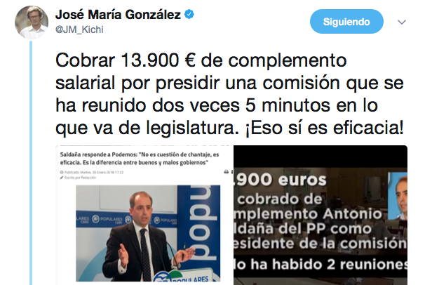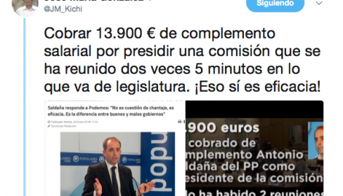 En este contexto, irrumpió el alcalde de Cádiz, José María González Kichi, a través de su cuenta de Twitter, una de las más seguidas a nivel político de España, para asestar uno de esos zascas en toda regla al también parlamentario andaluz y portavoz en el Ayuntamiento de Jerez: "Cobrar 13.900 euros de complemento salarial por presidir una comisión que se ha reunido dos veces 5 minutos en lo que va de legislatura. ¡Eso sí es eficacia!". A esto, añadió: "Sin embargo, lo que han hecho con el empleo en este país es una trituradora; destruir 3,8 millones de empleos entre la crisis y las medidas de ajuste de 2011-2013 y convertir una parte de ellos en jornales basura que no dan para pagar las facturas".