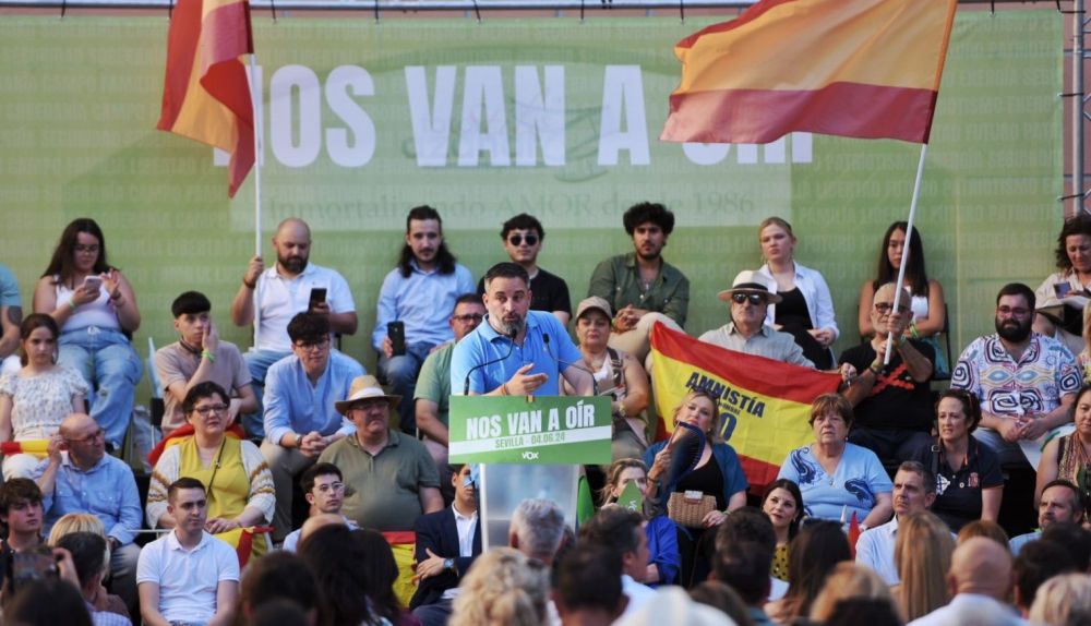 Vox ha celebrado este martes su primer gran acto electoral en Andalucía. Santiago Abascal ha estado junto a Hermann Tertsch, candidato al Parlamento Europeo, en Sevilla Este entre un mar de banderas de España entre las que se podía ver alguna falangista y otras contra la amnistía. Además, también ha habido mucha presencia de jóvenes en un mitin marcado por el discurso que Vox está llevando a cabo esta campaña: antiinmigración y contra la Agenda 2030.