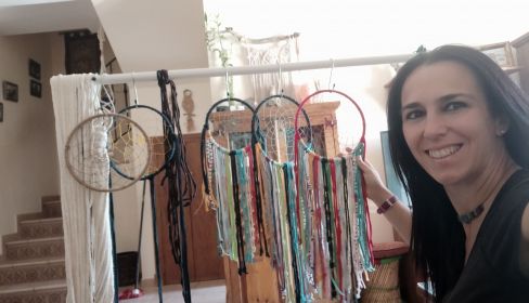Pulseras, colgantes, cinturones, bolsos, cortinas, portavelas, atrapasueños, tapices o diferentes prendas de vestir son algunos de los trabajos que Rocío expone en el pequeño taller en el que se ha convertido su casa en Arcos.