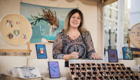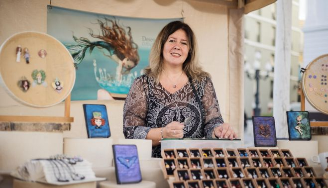 Primera hora de la mañana en Cádiz. La capital despierta con molletes de jamón, idas y venidas de autobuses y artesanos. En la plaza San Juan de Dios, centro neurálgico para creadores, una mujer prepara su puesto. La argentina Adriana Siri, de 52 años, coloca pendientes, colgantes y marcapáginas sobre una mesa que, en unos minutos estará repleta de figuras realizadas con arcilla polimérica.