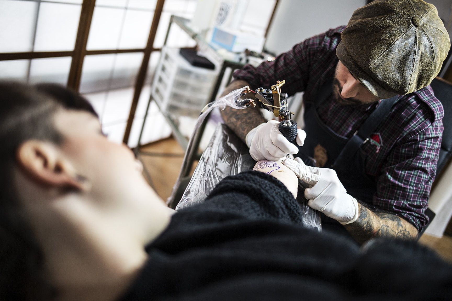 El estudio –que también es tienda– está decorado con sus propias creaciones. “No bebés, no acompañantes, no alcohol, solo tattoos”, advierte uno de los numerosos carteles que hay colgados en una de las paredes. De fondo se escucha el ruido de la aguja de Lacalle, que está atendiendo a una clienta. El resto está cubierto por dibujos suyos o del propio Popeye. Flores de todo tipo, personajes de ficción, mariposas, serpientes, amazonas… De todo un poco.