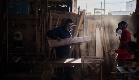 Todos los objetos llegan en bruto, por lo que, se encargan de darles forma y llevar a cabo los trabajos pertinentes de limpieza y restauración. Desde el taller, un equipo de profesionales con conocimientos de carpintería trata minuciosamente cada pieza. Los artesanos Alí y Osmani cepillan la madera recuperada de unas vigas procedentes del techo de una bodega de El Puerto.
