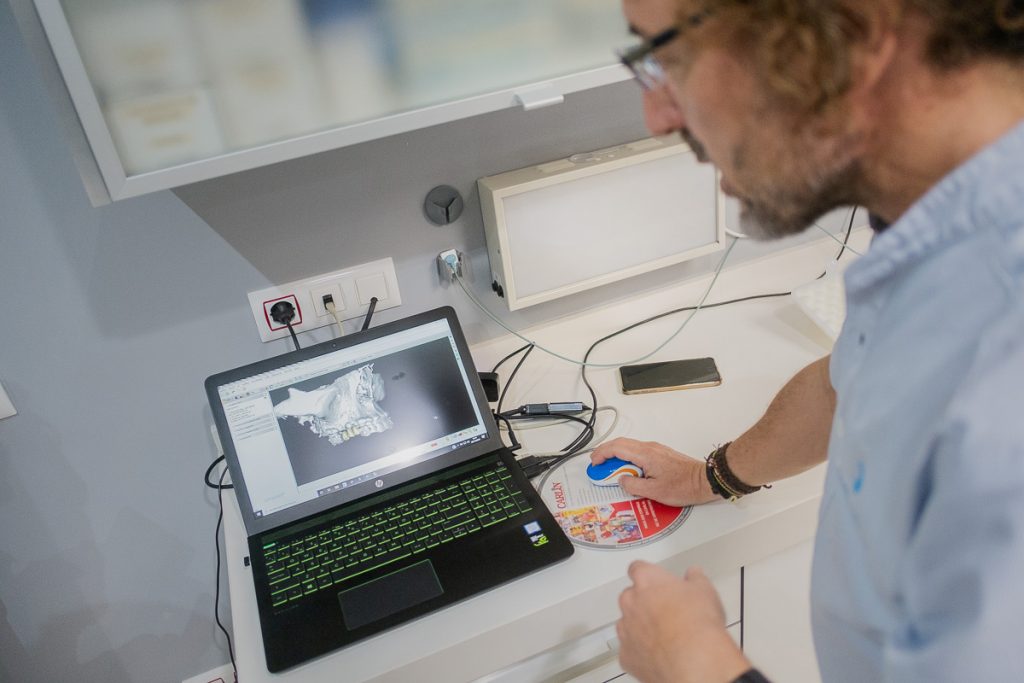 Moviendo micra a micra, Fernando trabaja la boca del paciente en el ordenador, a tres planos. “Aquí va un implante y aquí otro”, dice mientras coloca con el ratón los milímetros de margen. “¿Ves? Así respetamos todos los márgenes”, dice dando la vuelta a la imagen. 2mm alrededor, rodeados de hueso con objeto de que el día de mañana el paciente no tenga ningún problema. “De esta forma no hay margen de error y así los implantes duran en el tiempo”, concluye.