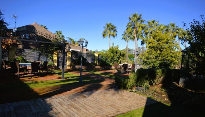 También cuenta con una zona de descanso, un container con extensión usado como trastero y una edificación de unos 76 metros actualmente acondicionada como gimnasio. Todo ello se organiza alrededor de un camino de acceso de hormigón impreso flanqueado por palmeras, que conecta con la puerta automatizada del frontal principal.